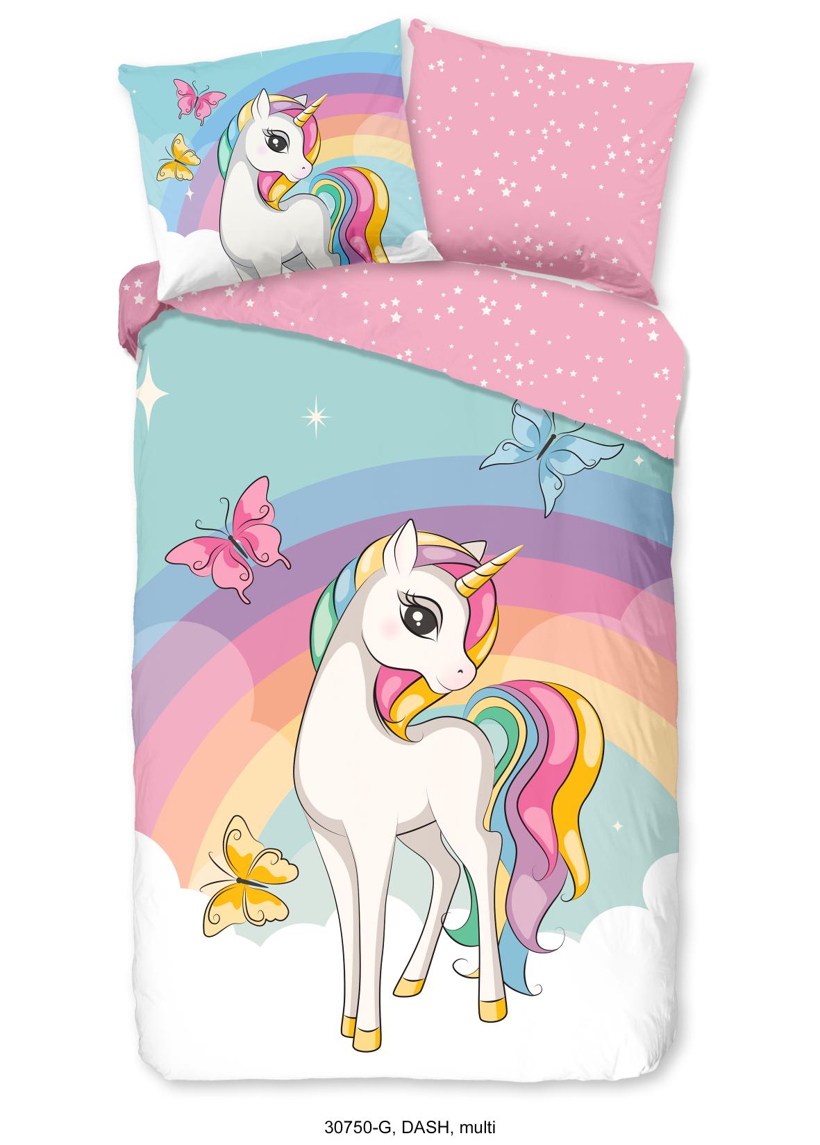 Housse de couette pour enfants Dash de Good Morning en couleur multi, avec un imprimé de licorne et arc-en-ciel. La housse de couette est faite de 100% coton. Cette qualité est respirante, absorbante et douce au toucher. Cette jolie housse de couette pour enfants est un ajout amusant à toute chambre d'enfant. La housse de couette pour enfants est adaptée à toutes les saisons. Le coton 100% est agréablement frais en été et procure de la chaleur en hiver.