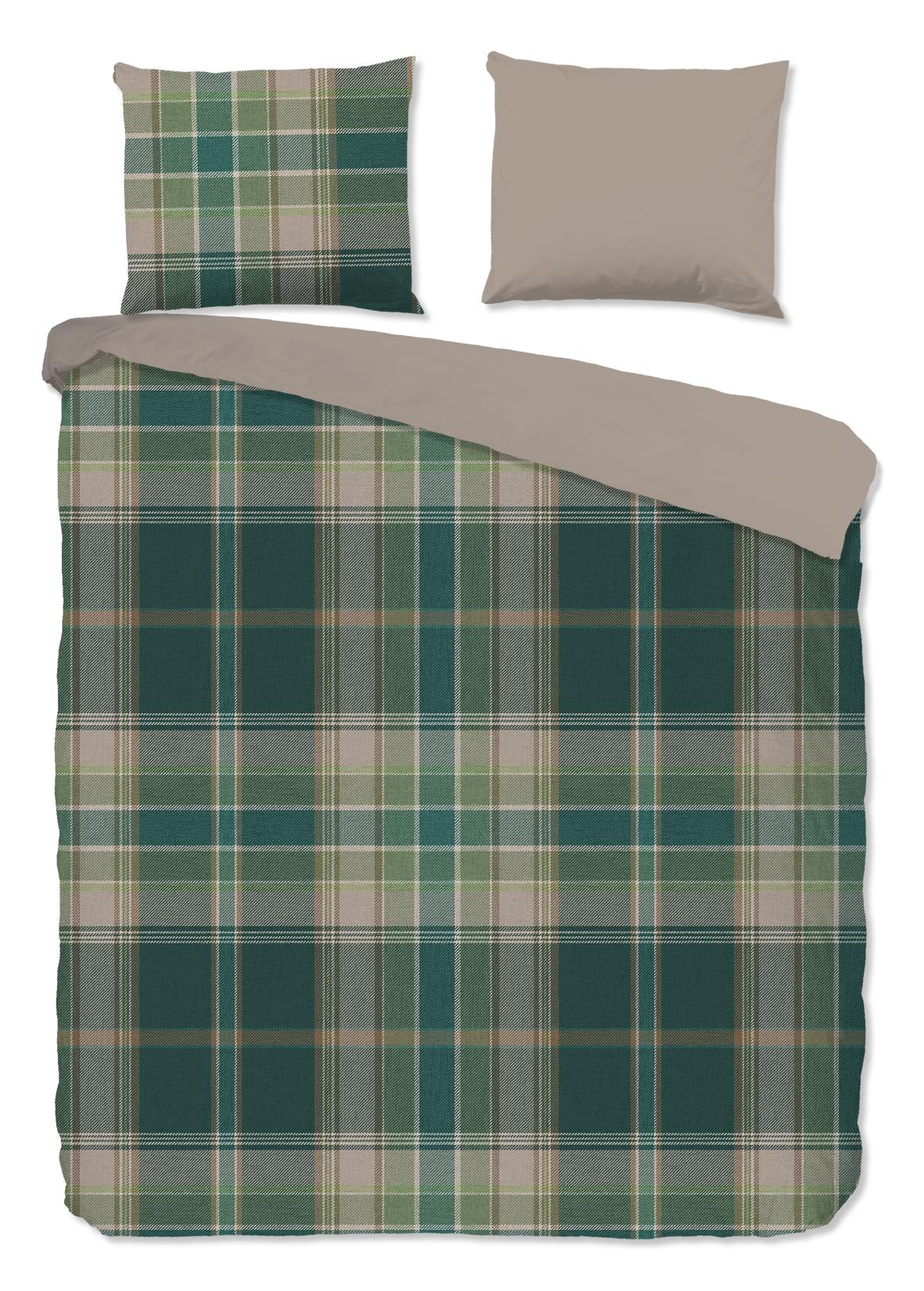 Housse de couette en flanelle Dirkje de Good Morning, de couleur verte, avec un motif à carreaux écossais. La housse de couette est fabriquée en 100% coton/flanelle légèrement brossé, créant une couche douce comme du velours qui est agréablement chaude - parfaite pour les nuits froides. Cet article est certifié Oeko-Tex (Oeko-Tex Standard 100) : exempt de substances nocives et respectueux de la peau. Lavable à max. 40°C et adapté au sèche-linge.