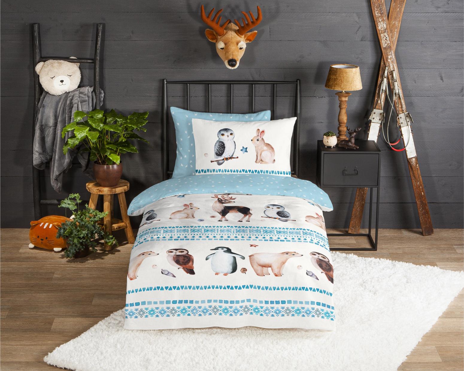 Housse de couette pour enfants en flanelle Freezing de Good Morning, de couleur bleue, avec un imprimé d'animaux d'hiver. La housse de couette est faite de 100% coton/flanelle légèrement brossé, créant une couche douce comme du velours qui est agréablement chaude - parfaite pour les nuits froides. Ce tissu chaud et confortable est respirant et absorbe l'humidité. Cette jolie housse de couette pour enfants est un ajout à toute chambre d'enfant. Les housses de couette en flanelle sont particulièrement adaptées aux mois d'hiver froids. Cet article est certifié Oeko-Tex (Oeko-Tex Standard 100) : exempt de substances nocives et respectueux de la peau. Lavable à max. 40°C et adapté au sèche-linge.