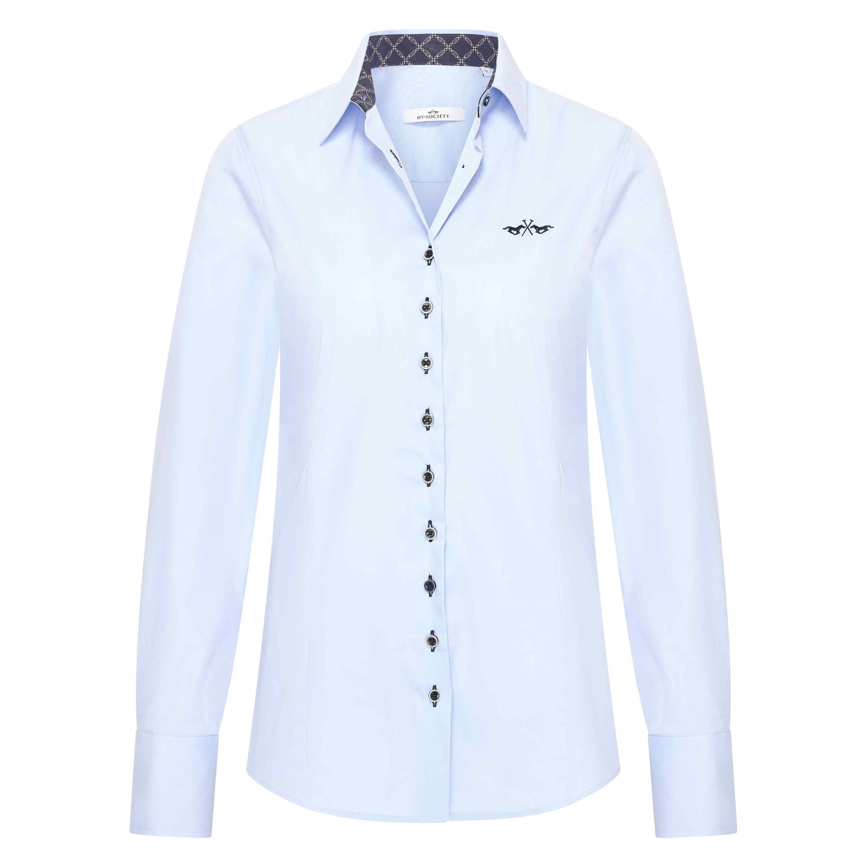 La HVSColette est une blouse pour femmes à coupe ajustée avec un imprimé logo contrastant à l'intérieur des poignets et du col. La blouse présente un col classique, un dos allongé, une fermeture à boutons sur le devant avec des boutons de marque, une fente avec fermeture à bouton sur les poignets, et un logo brodé subtil sur la poitrine, contribuant à un look raffiné et élégant.