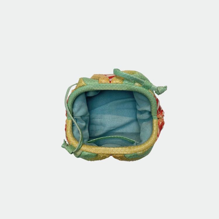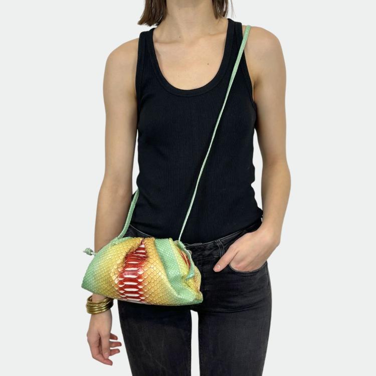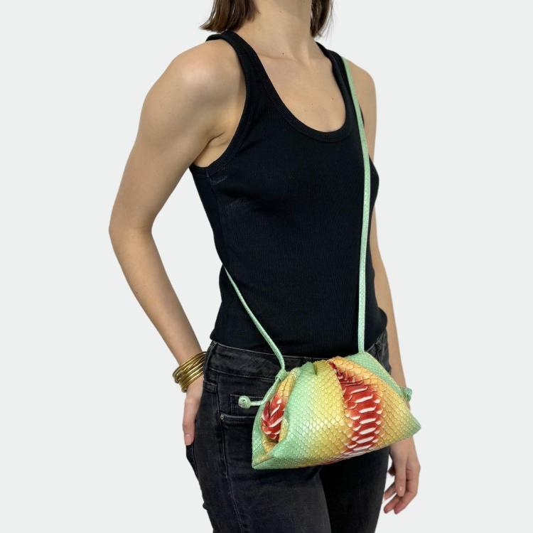 Pochette souple en python, avec doublure intérieureen coton et fermeture magnétique. Compartimentunique avec petite poche. Bandoulière en pythonDimensions du sac : 23 x 18 cm