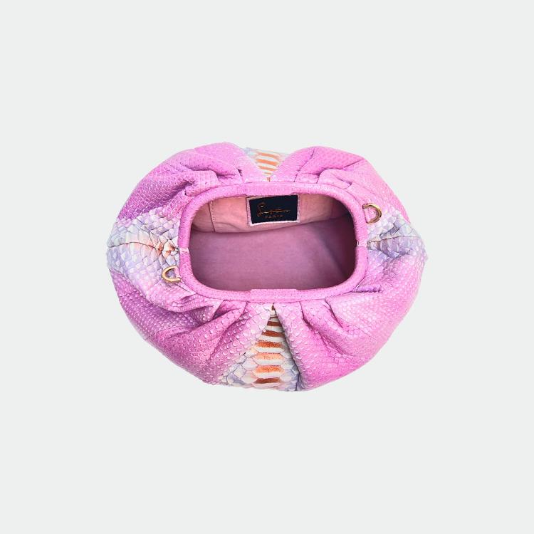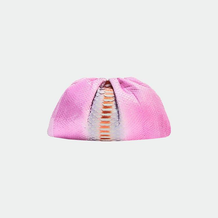 Pochette souple en python, avec doublure intérieure en coton et fermeture magnétique. Compartiment unique avec petite poche. Finitions métalliques. Bandoulière amovible en python.