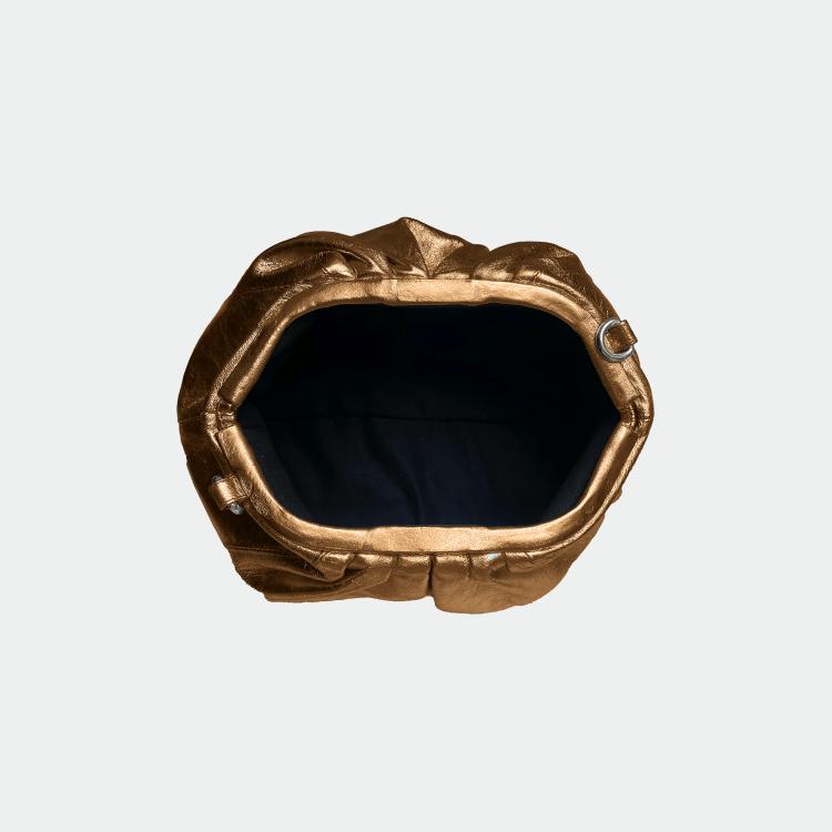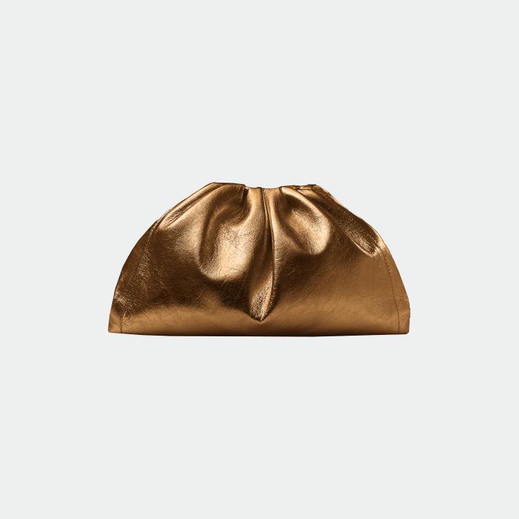 Pochette souple en cuir, avec doublure intérieure en coton et fermeture magnétique. Compartiment unique avec petite poche. Finitions métalliques. Bandoulière amovible en cuir