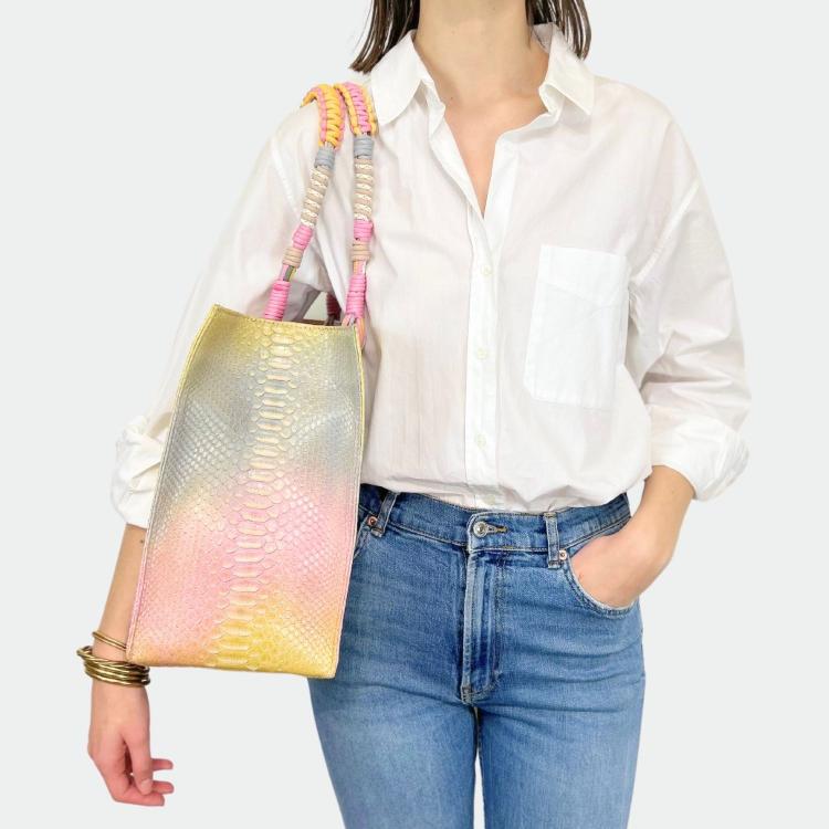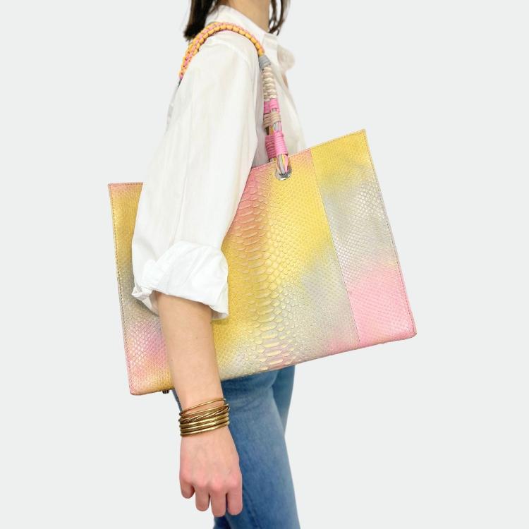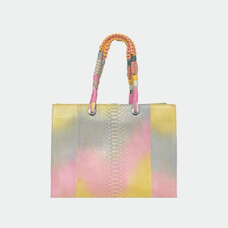 Sac en python, avec doublure intérieure en coton et anses tressées.