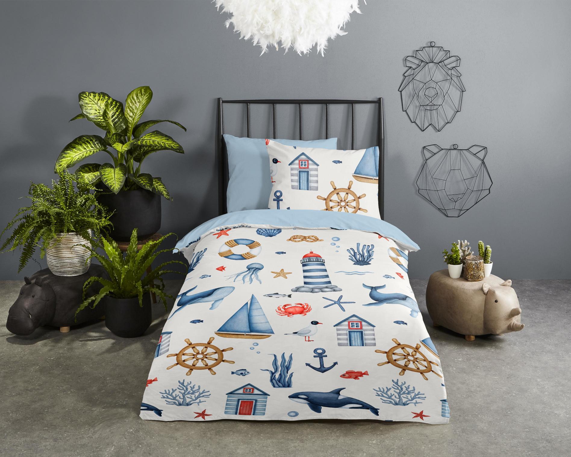 Housse de couette pour enfants Ahoy de Good Morning en bleu, avec un motif maritime. La housse de couette est faite de 100% coton. Cette qualité est respirante, absorbante et douce au toucher. Cette jolie housse de couette pour enfants est un ajout amusant à toute chambre d'enfant. La housse de couette pour enfants est adaptée à toutes les saisons. Le coton 100% est agréablement frais en été et procure de la chaleur en hiver. Cet article est certifié Oeko-Tex (Oeko-Tex Standard 100) : exempt de substances nocives et respectueux de la peau. Lavable à max. 40°C et adapté au sèche-linge.