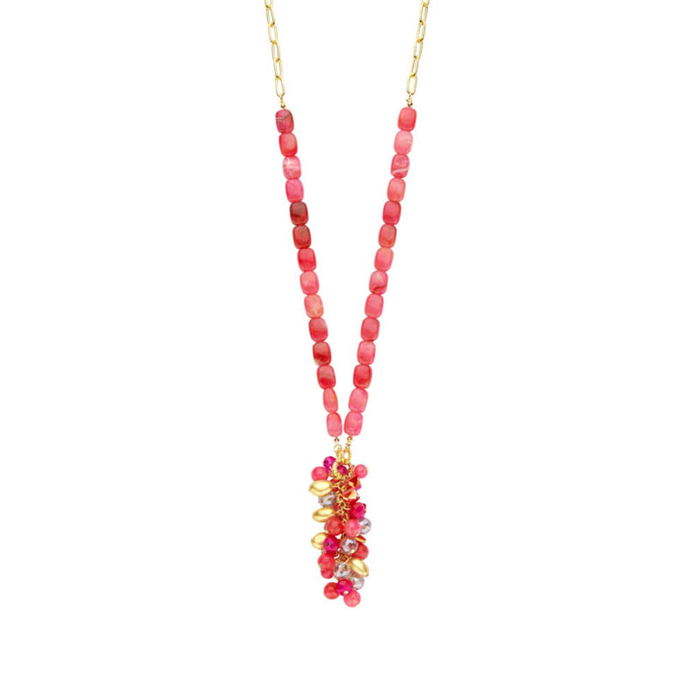 Sautoir de style bohème, pendentif de perles fuchsia en faisceau avec des accents dorés
