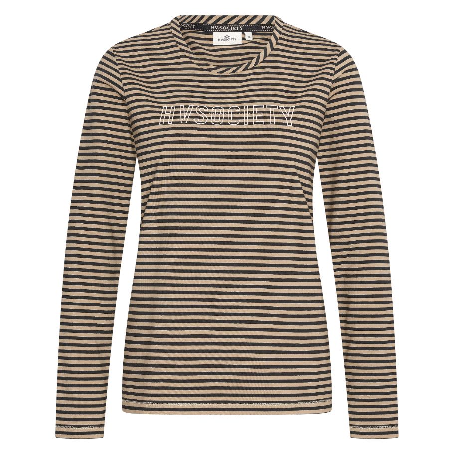 T-shirt à manches longues coupe ajustée * Jersey de coton stretch à rayures teintes * Imprimé artistique sur la poitrine mélangé avec des strass * Plaque logo en métal