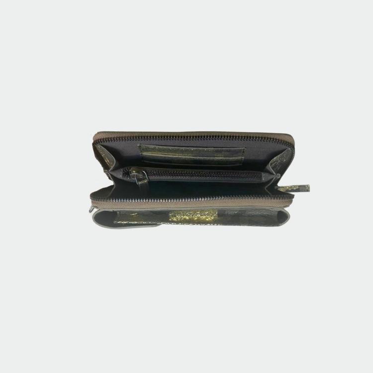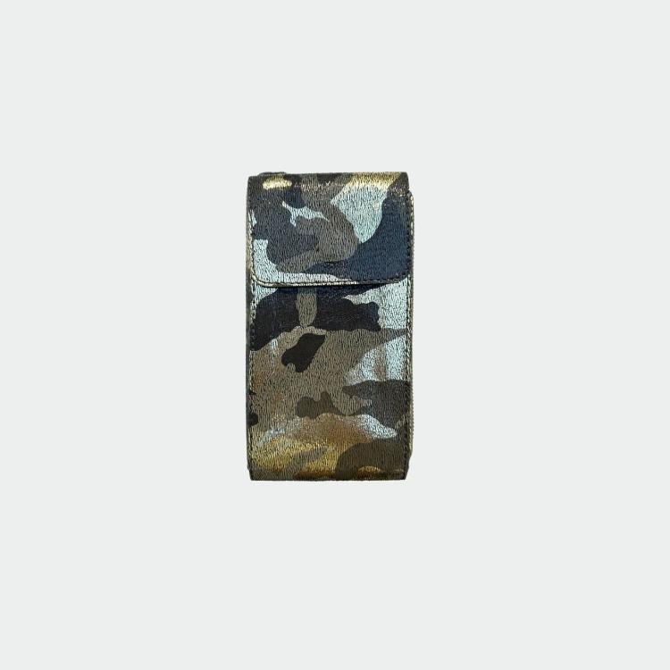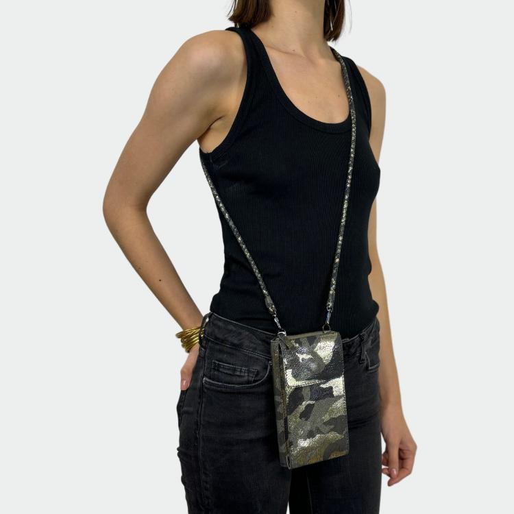 Pochette en cuir, avec double compartiment : compartiment portefeuille etcompartiment téléphone. finitions métalliques couleur noir. Bandoulière amovible encuir.Dimensions du sac : 17,5 x 10 cm
