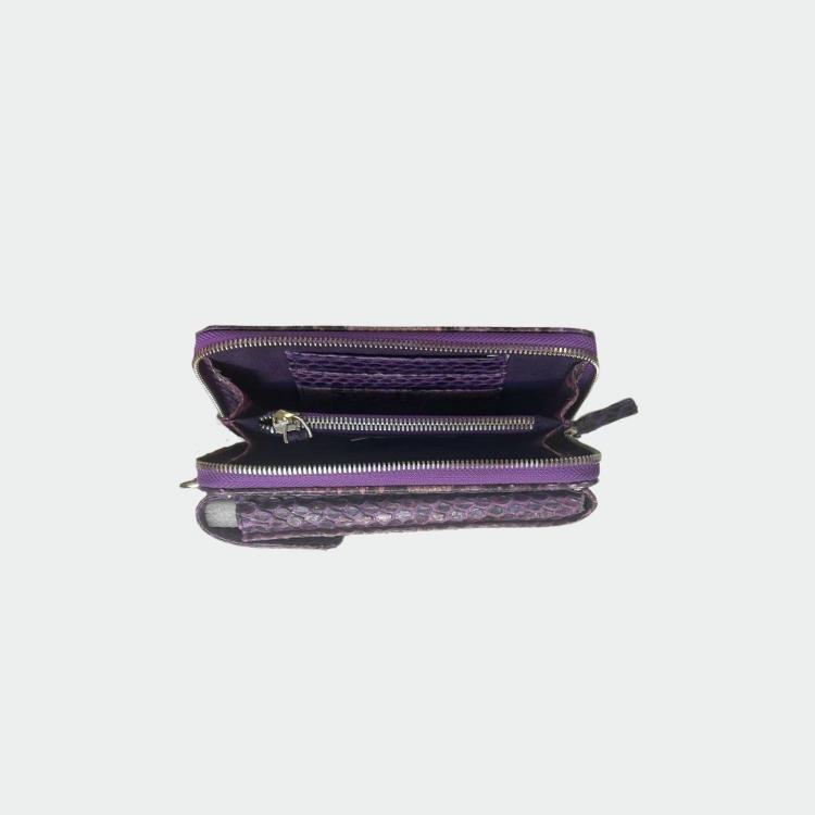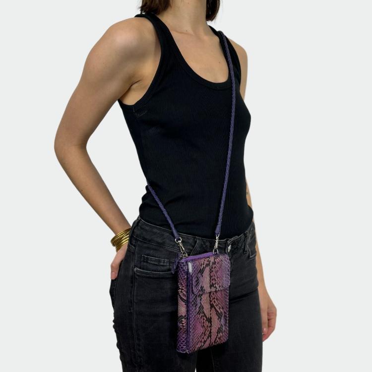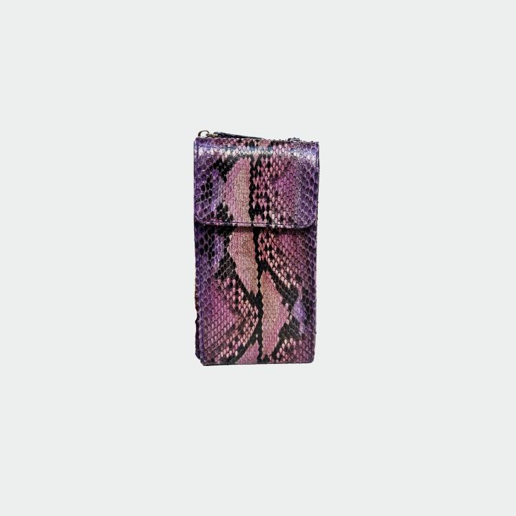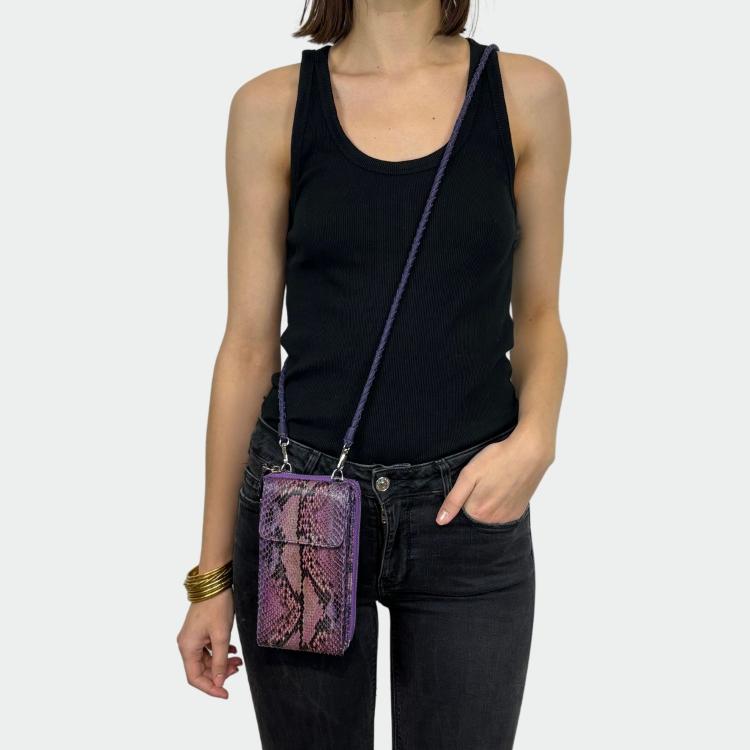 Pochette en python, avec double compartiment : compartiment portefeuille etcompartiment téléphone. finitions métalliques couleur noir. Bandoulière amovible encuir.Dimensions du sac : 17,5 x 10 cm