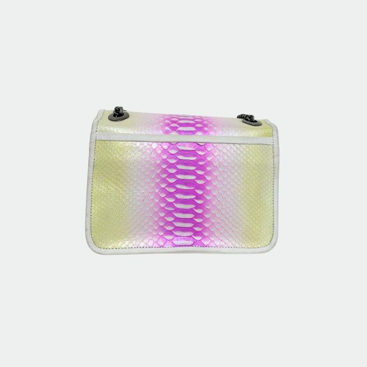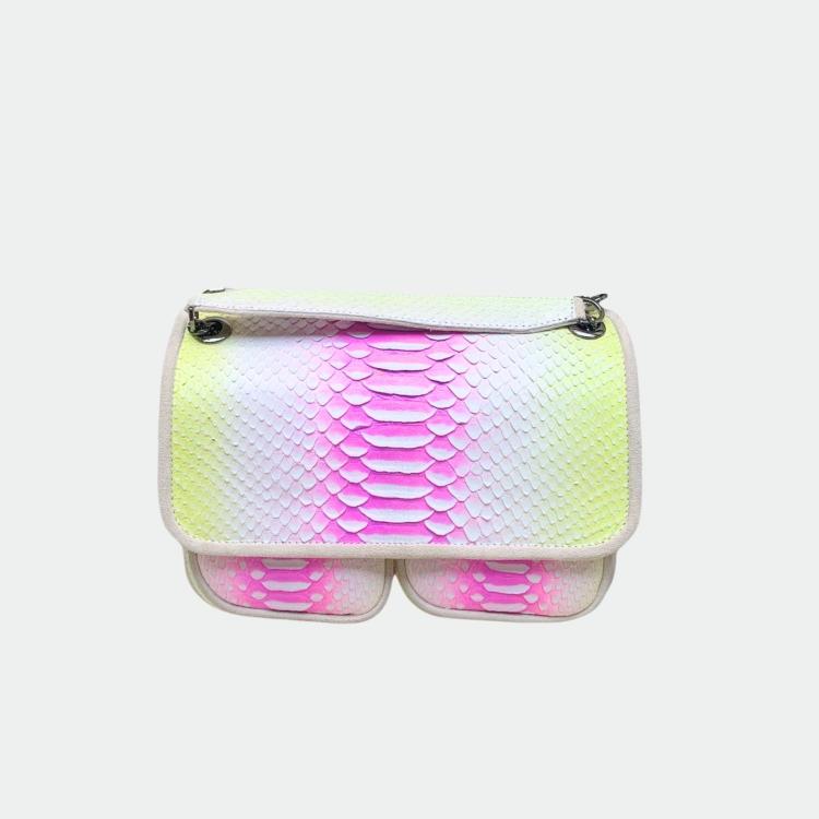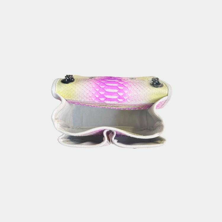 Sac en python, avec doublure intérieure en coton et anses en python et cuir. Un compartiment principal avec une petite poche et deux autres compartiments. Bandoulière métallique.