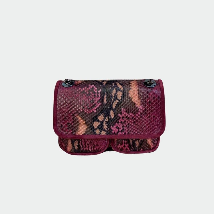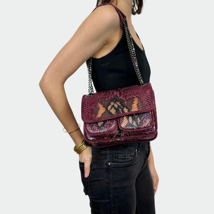 Sac en python, avec doublure intérieure en coton et anses en python et cuir. Un compartiment principal avec une petite poche et deux autres compartiments. Bandoulière métallique.