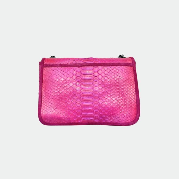 Sac en python, avec doublure intérieure en coton et anses en python et cuir. Un compartiment principal avec une petite poche et deux autres compartiments. Bandoulière métallique.