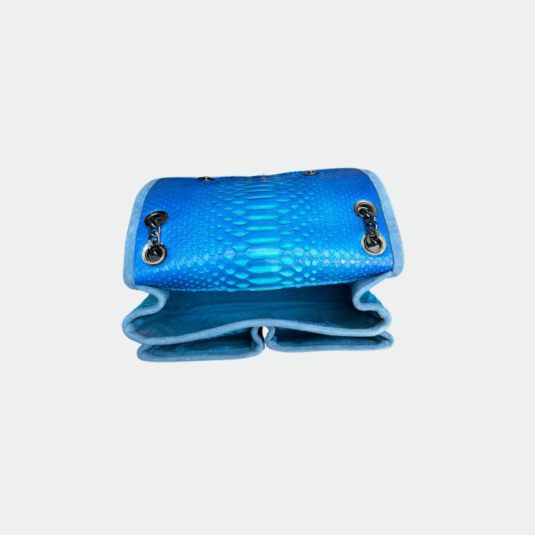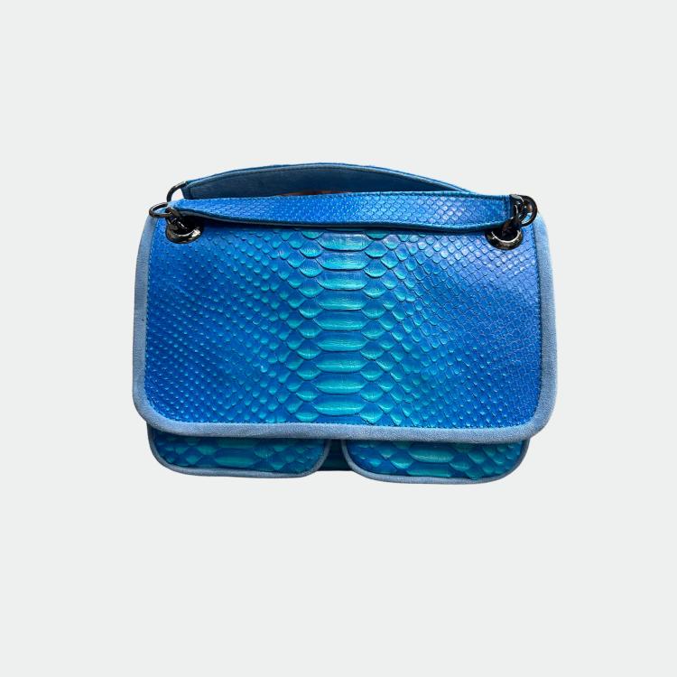 Sac en python, avec doublure intérieure en coton et anses en python et cuir. Un compartiment principal avec une petite poche et deux autres compartiments. Bandoulière métallique.