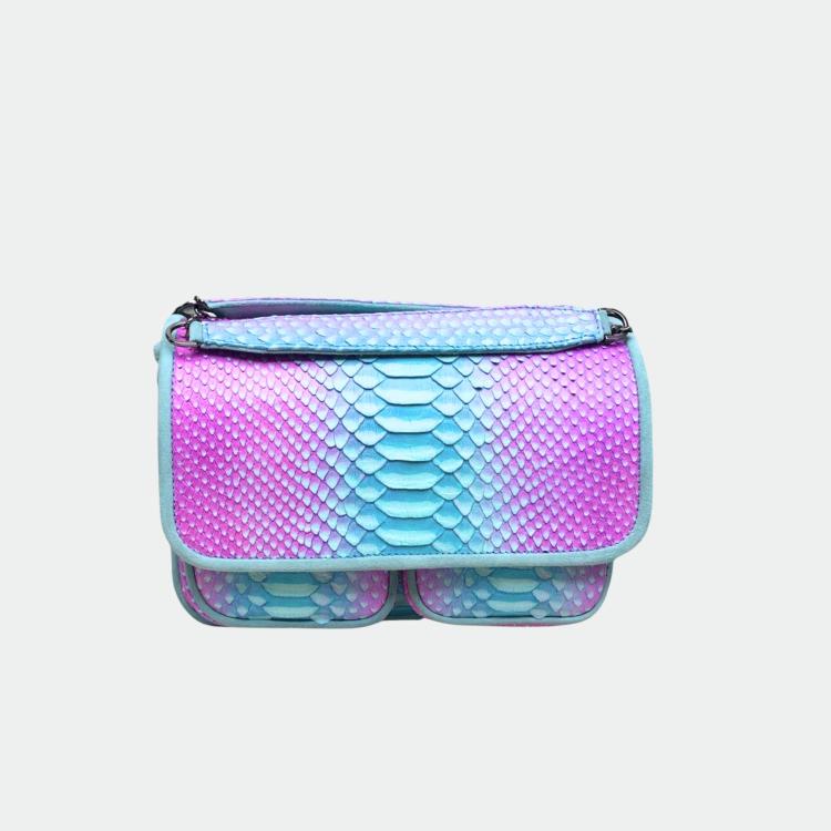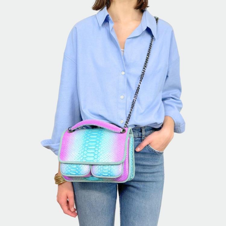 Sac en python, avec doublure intérieure en coton et anses en python et cuir. Un compartiment principal avec une petite poche et deux autres compartiments. Bandoulière métallique.