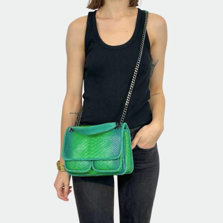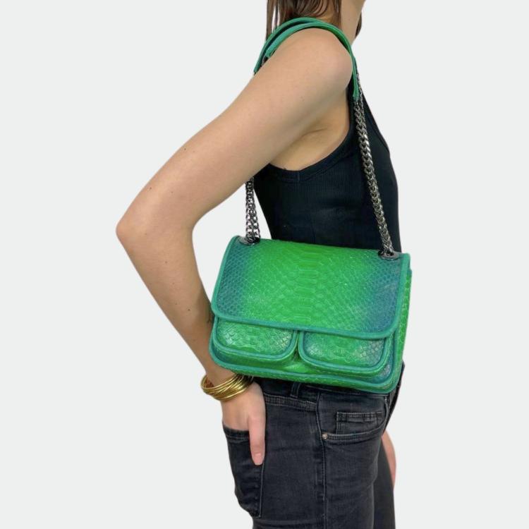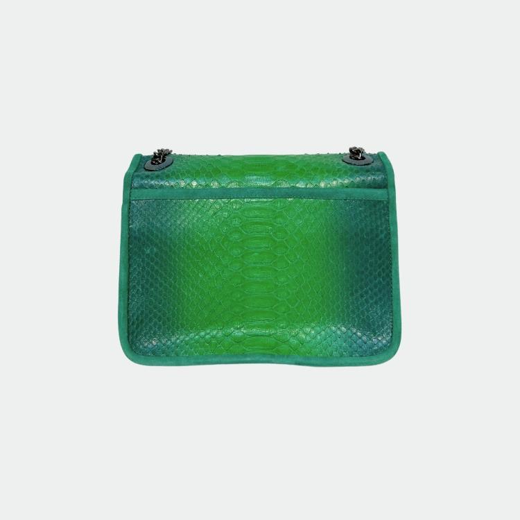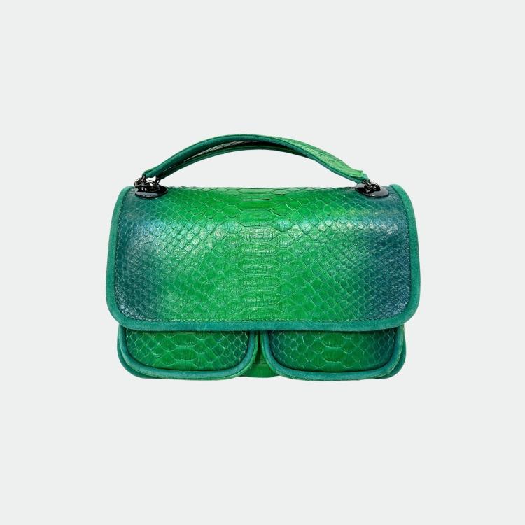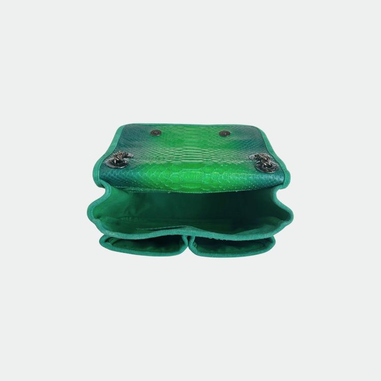 Sac en python, avec doublure intérieure en coton et anses en python et cuir. Un compartiment principal avec une petite poche et deux autres compartiments. Bandoulière métallique.