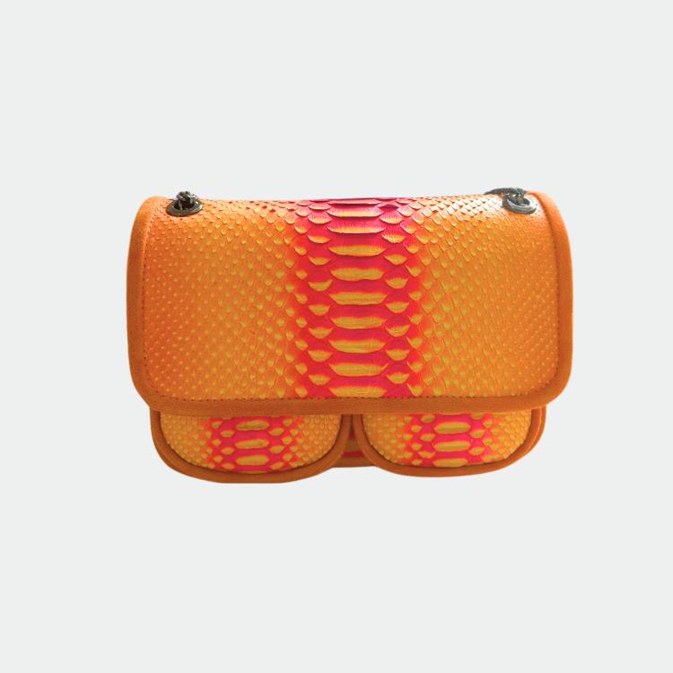 Sac en python, avec doublure intérieure en coton et anses en python et cuir. Un compartiment principal avec une petite poche et deux autres compartiments. Bandoulière métallique.