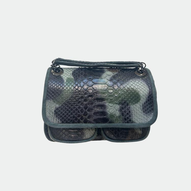 Sac en python, avec doublure intérieure en coton et anses en python et cuir. Un compartiment principal avec une petite poche et deux autres compartiments. Bandoulière métallique.