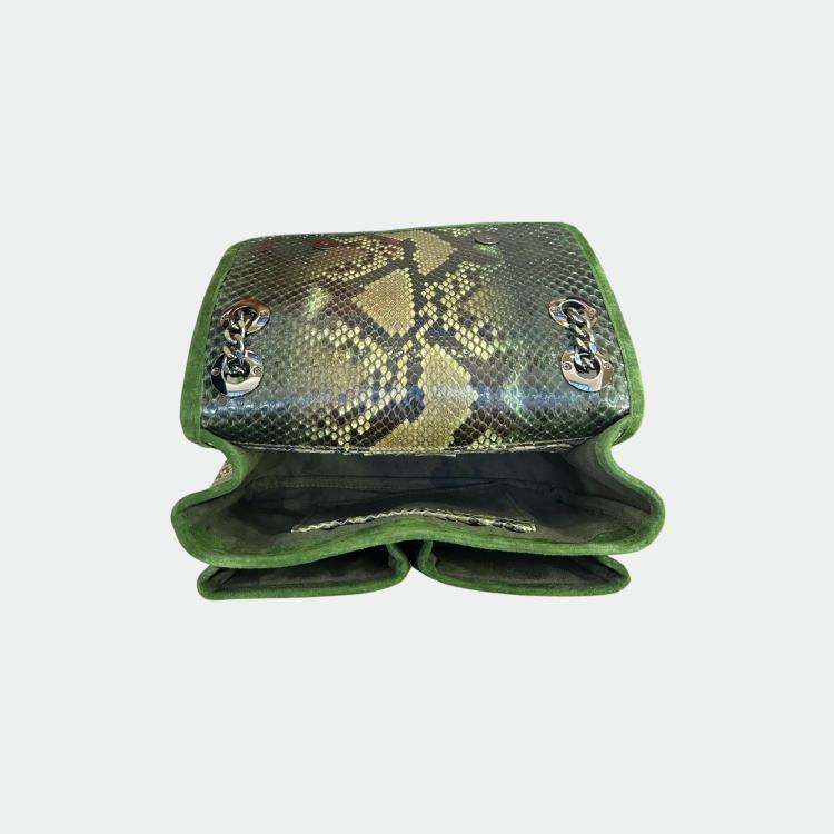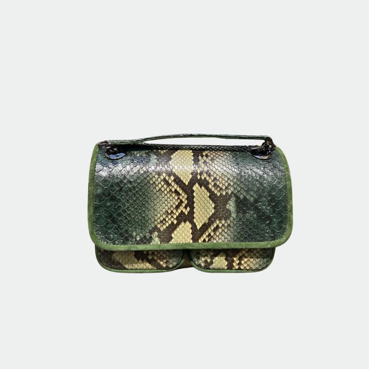 Sac en python, avec doublure intérieure en coton et anses en python et cuir. Un compartiment principal avec une petite poche et deux autres compartiments. Bandoulière métallique.
