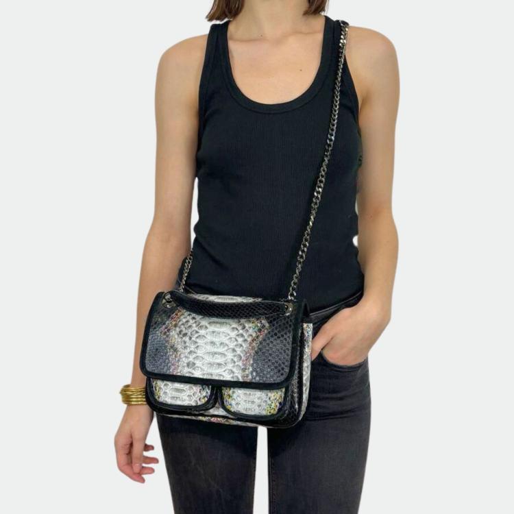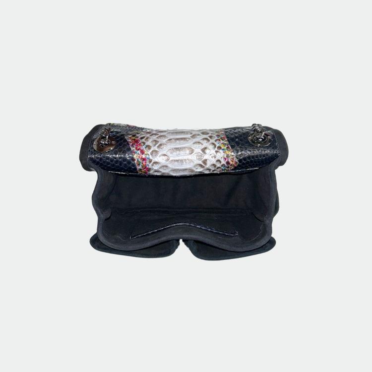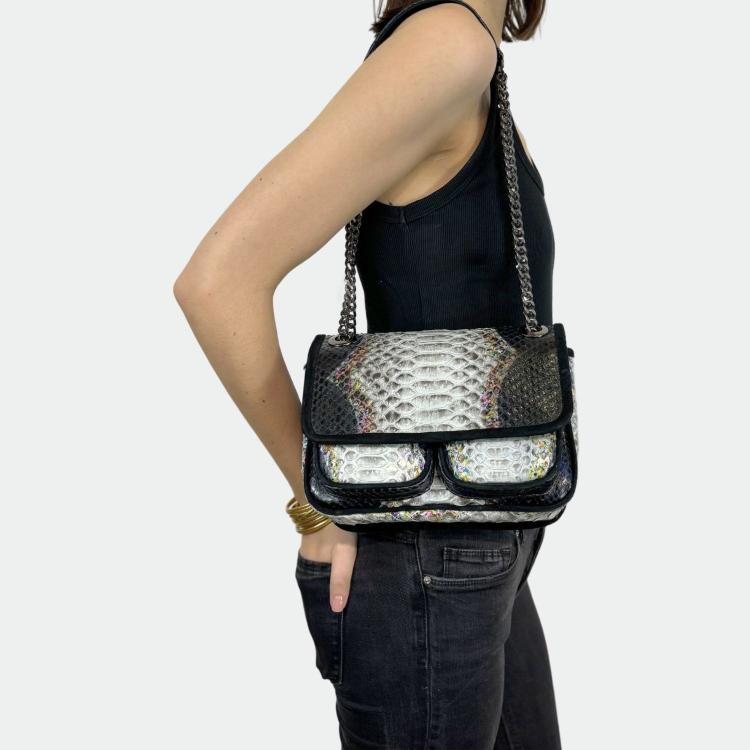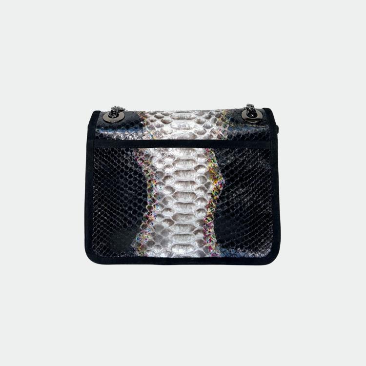 Sac en python, avec doublure intérieure en coton et anses en python et cuir. Un compartiment principal avec une petite poche et deux autres compartiments. Bandoulière métallique.